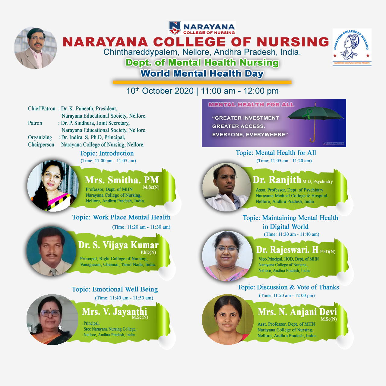 Department of Mental health nursing was established in 2003 with the intake of B. Sc Nursing students and in 2010, M.Sc. Nursing and PB. B. Sc Nursing.In the subject area, Syllabus, learning objectives, and learning outcome are followed as per Indian Nursing Council and the department has its plan of action, that would be revised as per each year’s requirement. The best practices being followed in the department is (BRICS)2 and Case Scenario practice.