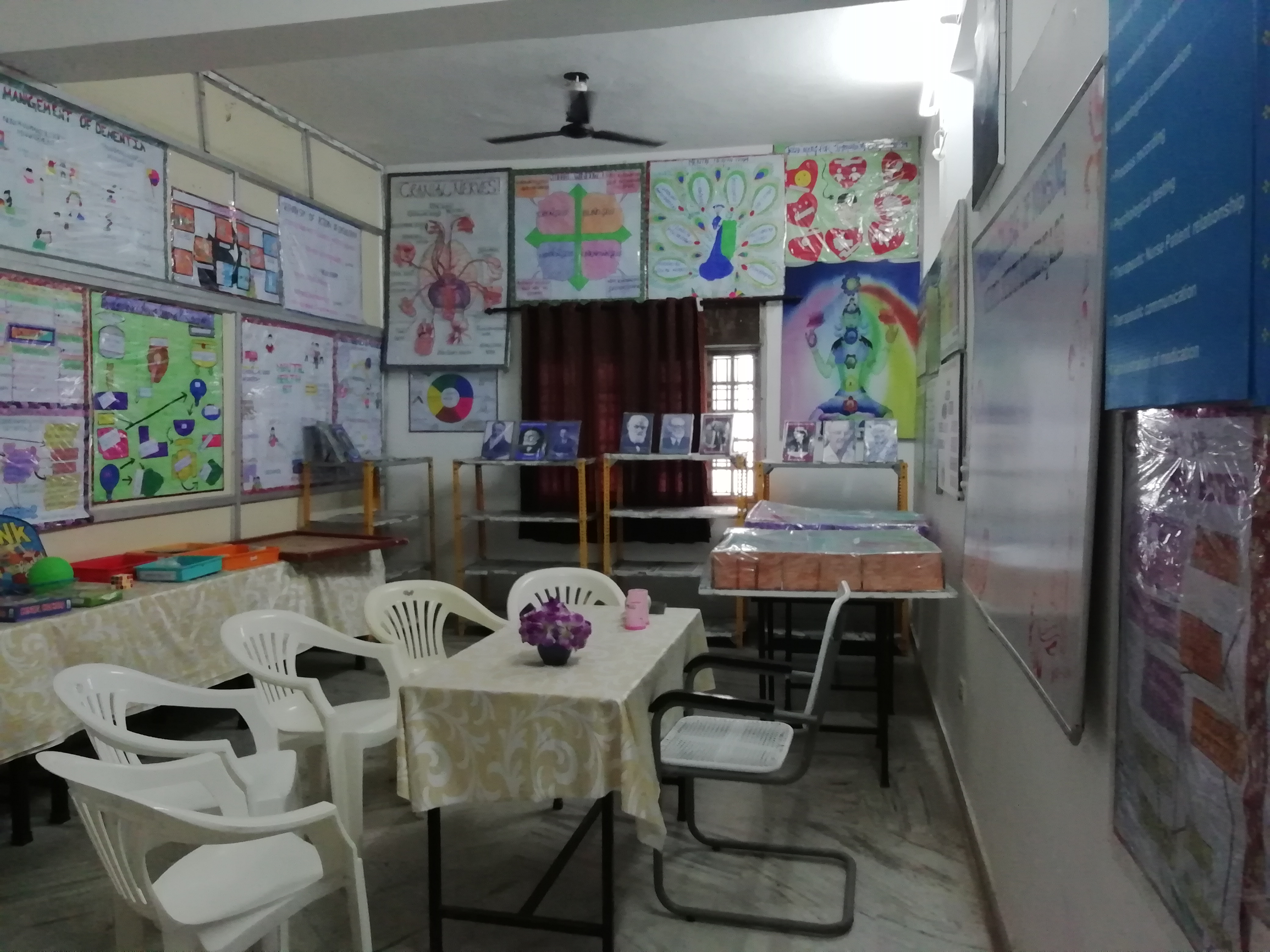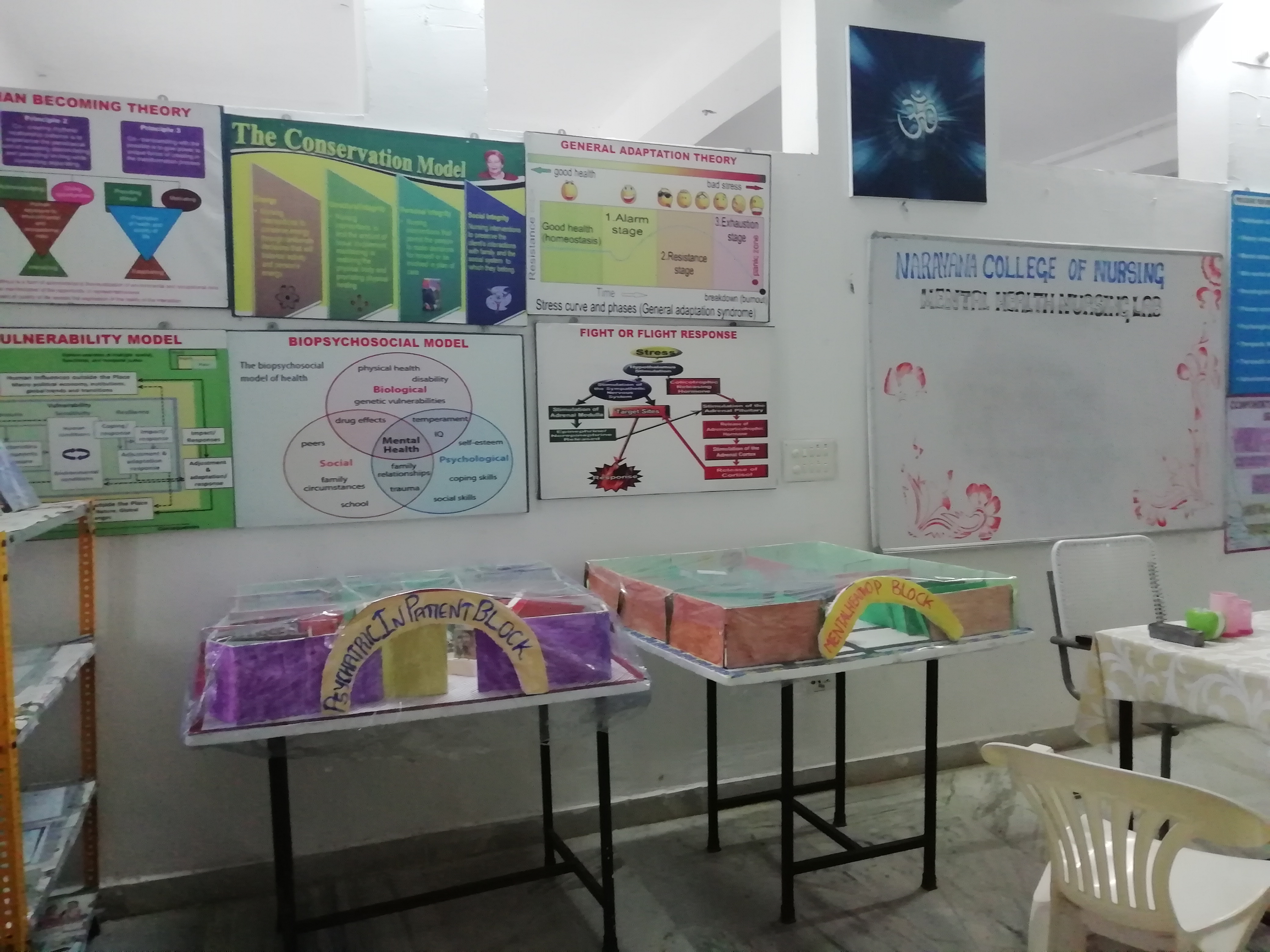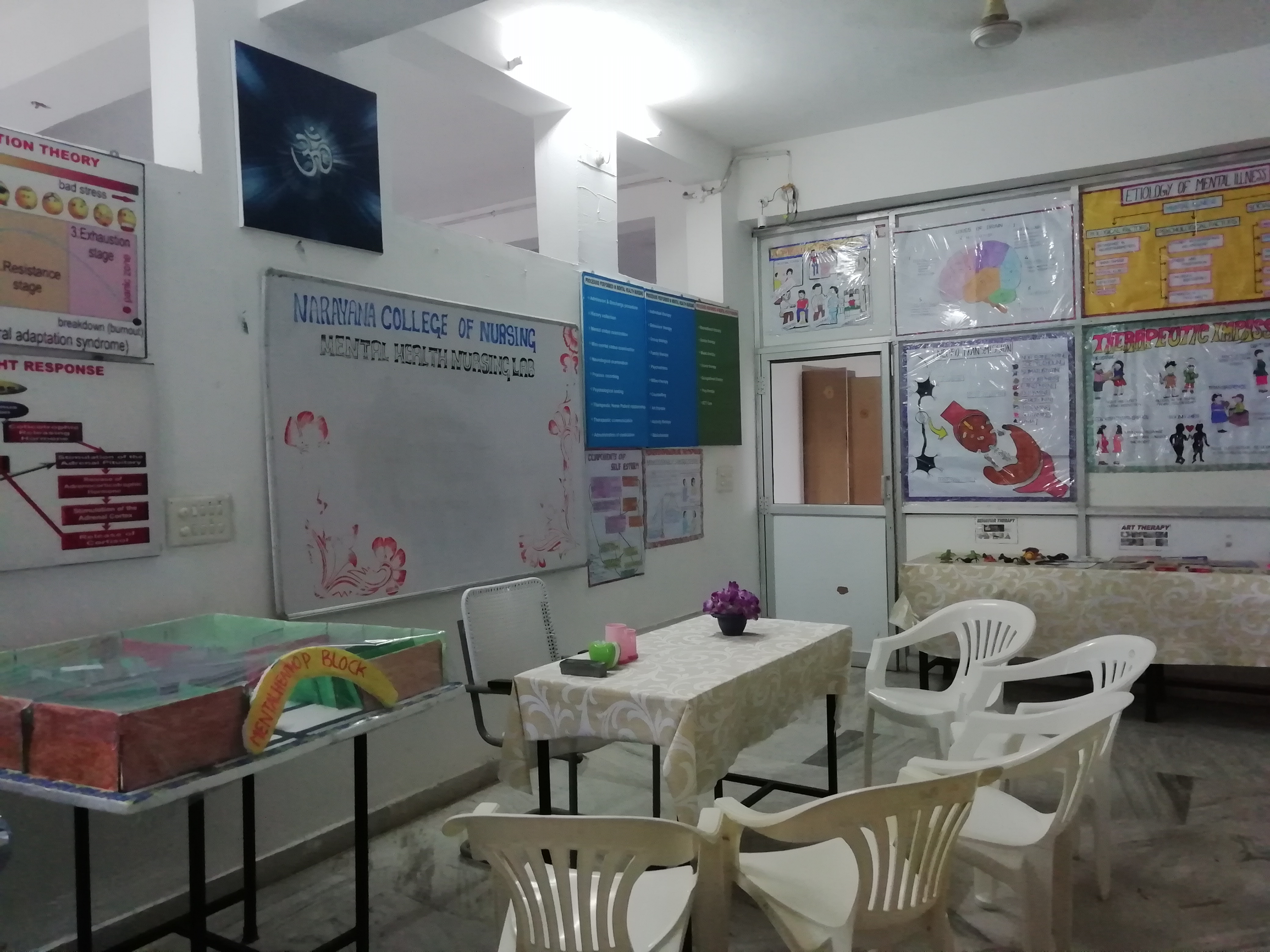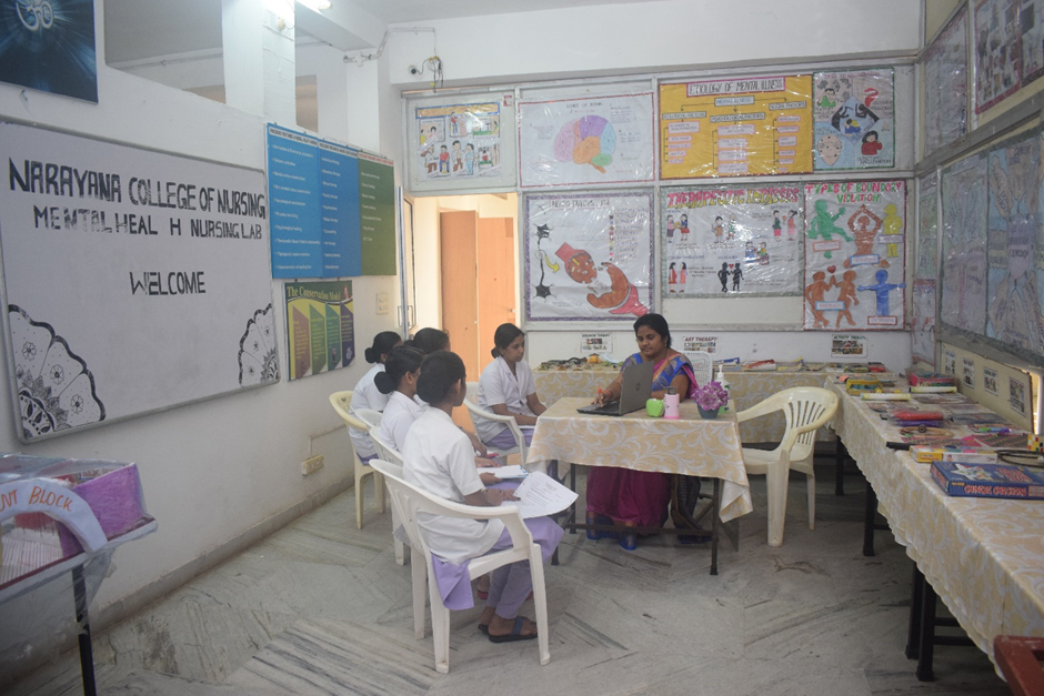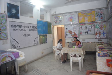 Department has a departmental library with Mental Health Nursing Text books, PG Dissertations, Mini Projects and UG Projects. The distinctiveness of our department is an exclusive Lab for Mental Health Nursing with 1500 sq. The lab has many psychiatric inventories, charts, models, and activity articles.Faculties of the department are part of managing the Nurse-Led Clinic run by Narayana College of Nursing and preparing the real and virtual educational materials for the health education purpose in the clinic.